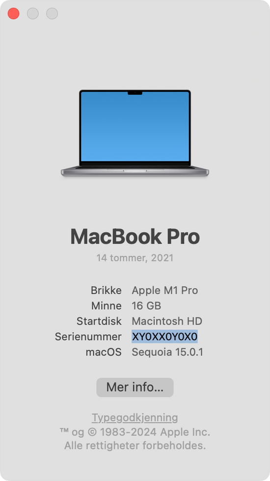 Velg Om denne maskinen fra Apple-menyen i hjørnet av skjermen. Vinduet som åpnes inkluderer modellnavnet og serienummeret, som vist i eksempelet under. Du kan også skrive inn serienummeret på checkcoverage.apple.com for å finne modellnavnet.