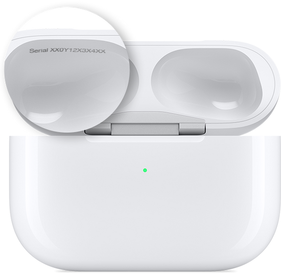 På AirPods så finner du serienummeret på innsiden av lokket på ladeetuiet. Og dersom AirPodsene dine er koblet til en iOS-enhet, som iPhone eller iPad, kan du også finne serienummeret ved å gå til Innstillinger > Generelt > Om > AirPods på den enheten.