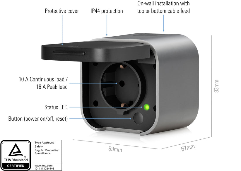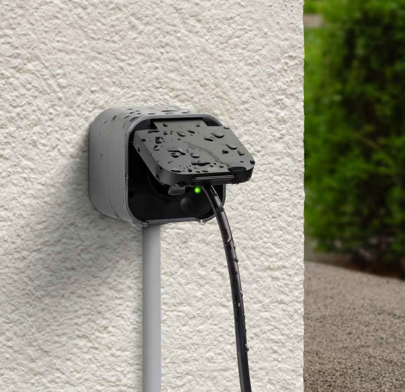 Spesialdesignet for utendørsbruk: Eve Energy Outdoor har IP44-klassifisering og et beskyttelseslokk som tåler både fukt og vær.