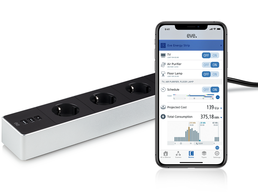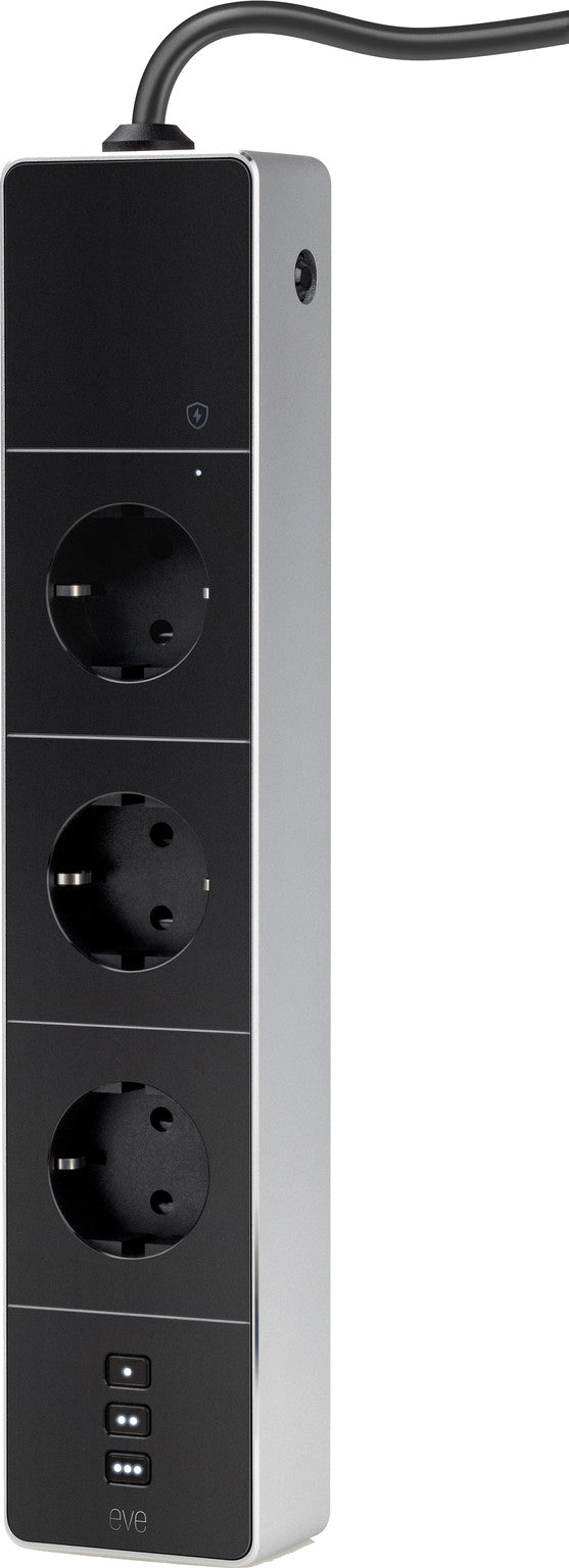 Med Eve Energy Strip kontrollerer du individuelt tre uttak med appen eller Siri. Synkroniser belysning og andre produkter med din daglige rytme. Vær trygg på at dine tilkoblede investeringer er beskyttet og hvor lett det kan være å forstå energiforbruket ditt.