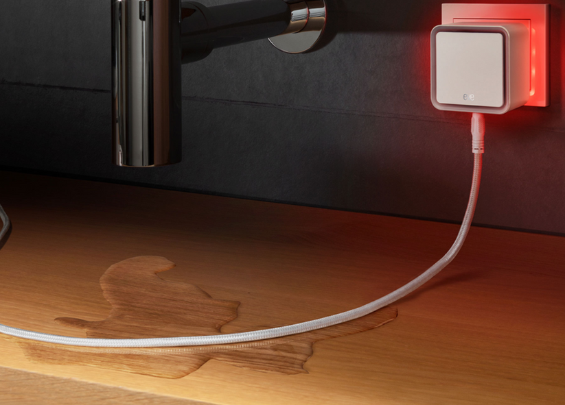 Forlat hjemmet selv med vaskemaskinen i gang. Vær helt trygg på at det ikke lekker vann i skapene eller under vannrørene. Følg med i kjelleren, selv om du ikke er der så ofte. Eve Water Guard oppdager vannlekkasjer i det øyeblikket de oppstår – visuelt, tydelig hørbart og via en app på din iPhone. Den medfølgende vannsensorkabelen på 2 m kan trekkes ut opptil 150 m og fungerer som en sensor i full lengde for å overvåke store deler av rommet. Eve-appen påminner deg også med jevne mellomrom om å kontrollere at Eve Water Guard fungerer som den skal.