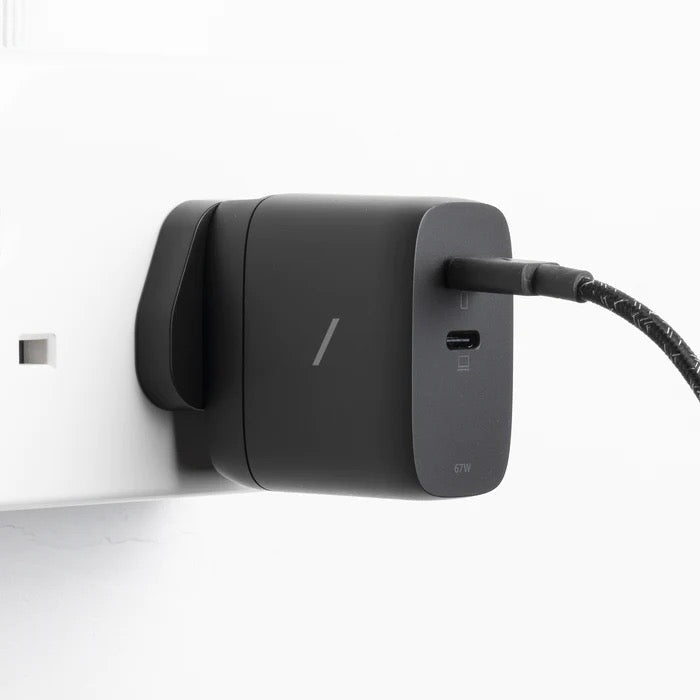 Native Unions 67W Power Delivery-vegglader med to USB-C porter i et kompakt deisgn, komplett med flere adaptere slik at enhetene dine er reiseklare hvor som helst, når som helst. Denne er kraftig nok til å lade MacBook, iPad og iPhone! Den lader opptil 67W ved bruk av en port og fordeler seg på 47W og 20W ved bruk av begge portene.