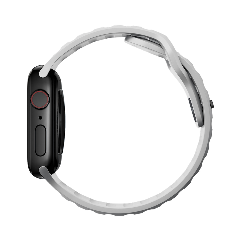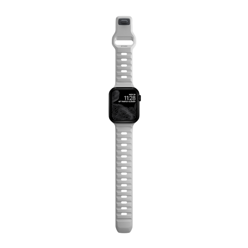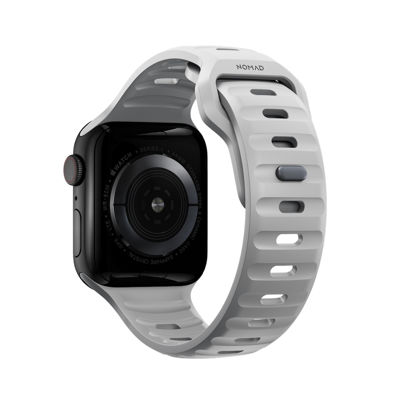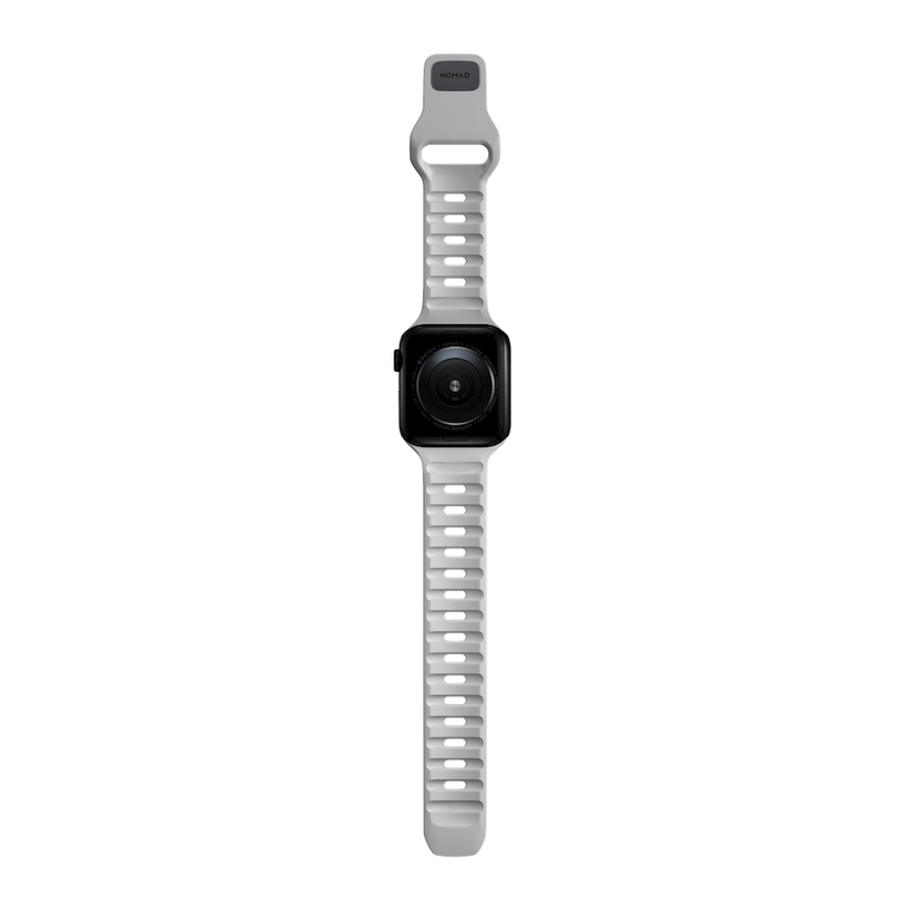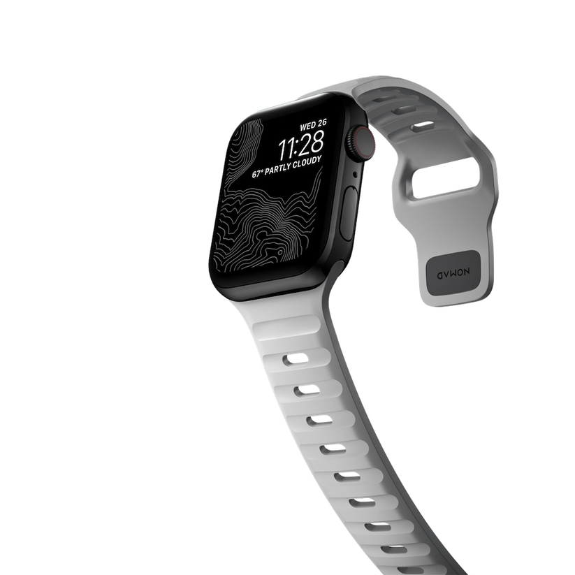 Nomad Sport Band er designet for å gi Apple Watch et moderne og elegant atletisk utseende for intense treningsøkter og hverdagsbruk. Sport Strap har et lett og pustende design som er laget av en myk, fleksibel FKM-gummi for komfort hele dagen. En pin-and-tuck-mekanisme med lav profil sikrer en sikker lukking.