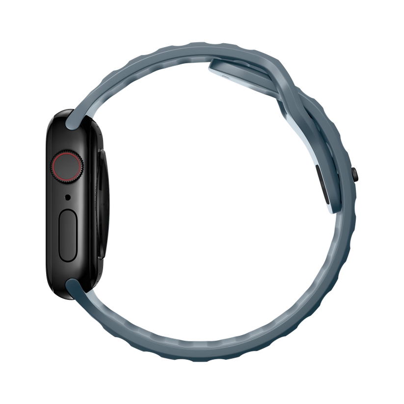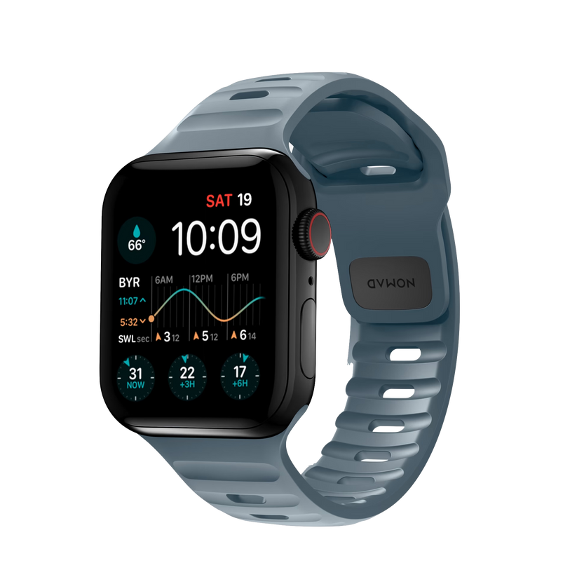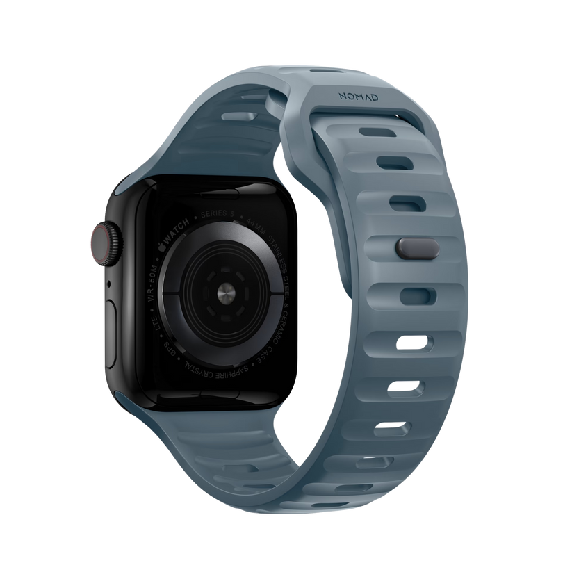 Nomad Sport Band er designet for å gi Apple Watch et moderne og elegant atletisk utseende for intense treningsøkter og hverdagsbruk. Sport Strap har et lett og pustende design som er laget av en myk, fleksibel FKM-gummi for komfort hele dagen. En pin-and-tuck-mekanisme med lav profil sikrer en sikker lukking.