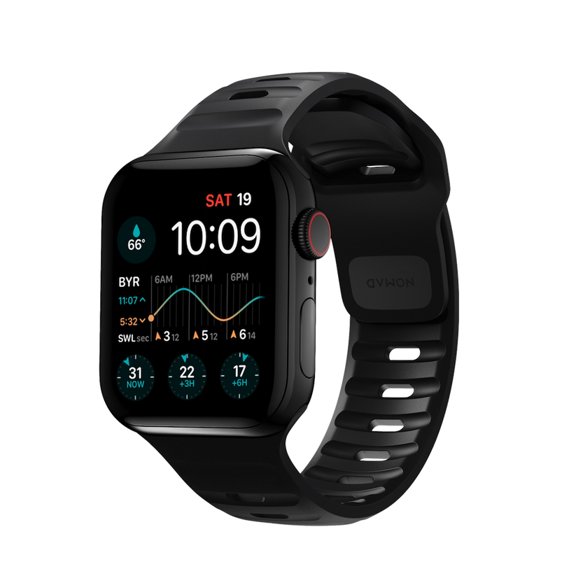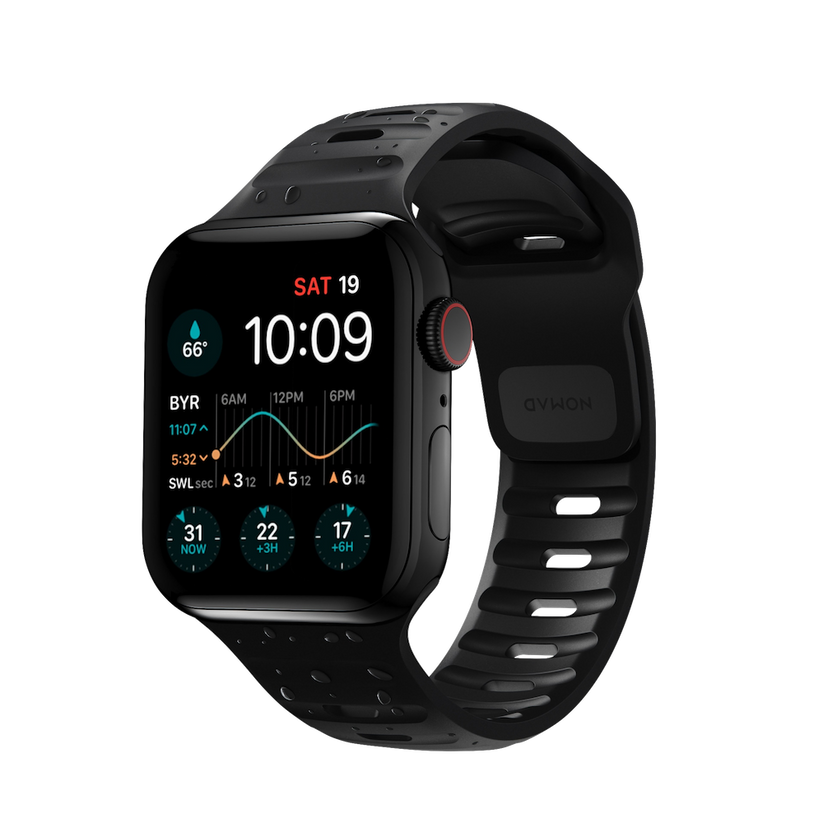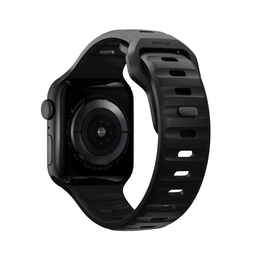Nomad Sport Band er designet for å gi Apple Watch et moderne og elegant atletisk utseende for intense treningsøkter og hverdagsbruk. Sport Strap har et lett og pustende design som er laget av en myk, fleksibel FKM-gummi for komfort hele dagen. En pin-and-tuck-mekanisme med lav profil sikrer en sikker lukking.