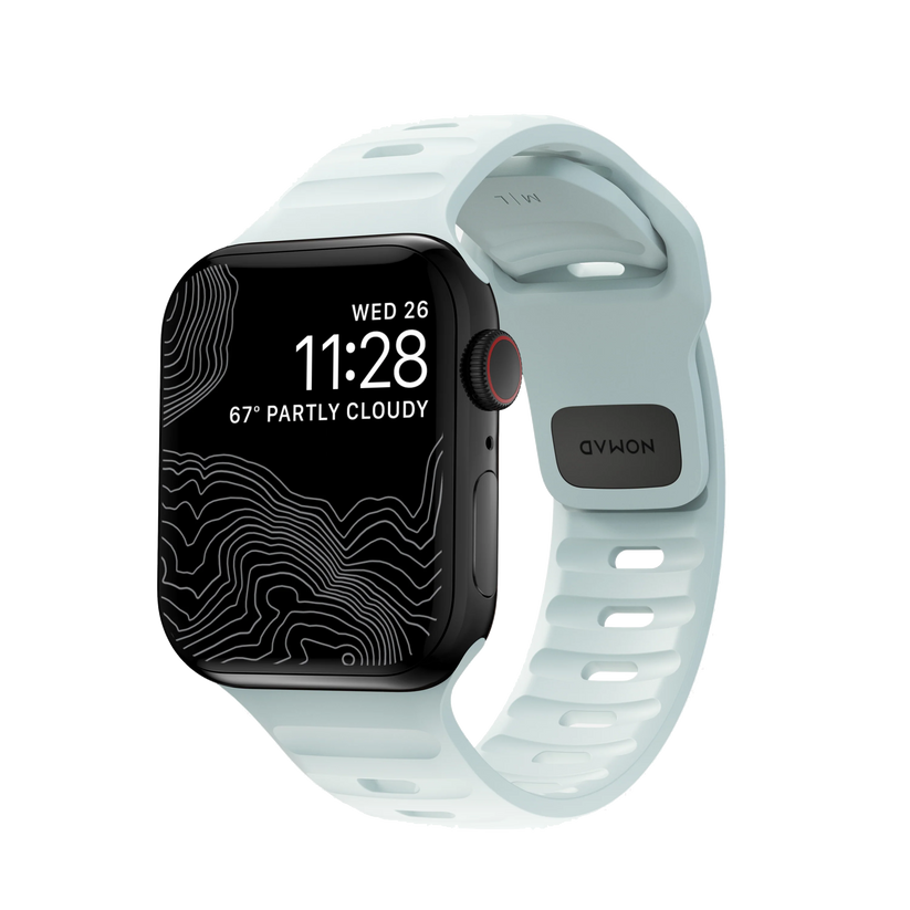 Nomad Sport Band er designet for å gi Apple Watch et moderne og elegant atletisk utseende for intense treningsøkter og hverdagsbruk. Sport Strap har et lett og pustende design som er laget av en myk, fleksibel FKM-gummi for komfort hele dagen. En pin-and-tuck-mekanisme med lav profil sikrer en sikker lukking.