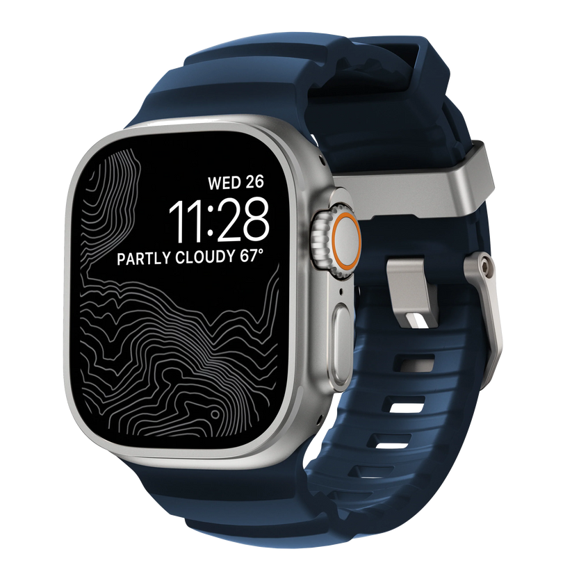 Rocky Point Bands ultratøffe FKM-kropp er 100 % vanntett og revner ikke under tøff behandling, noe som gjør den til den perfekte reimen for selv de mest krevende eventyrene. Den passer perfekt opp mot Apple Watch Ultras bredere ramme mens titan-låsene matcher klokkens finish perfekt. Reimens stoff er jevn og lett, og du kjenner knapt at du har den på deg. En z-formet overgangsseksjon tett rundt håndleddet beskytter mot svette og fuktighet.