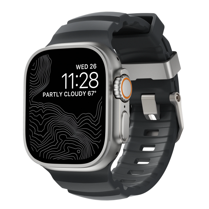 Rocky Point Bands ultratøffe FKM-kropp er 100 % vanntett og revner ikke under tøff behandling, noe som gjør den til den perfekte reimen for selv de mest krevende eventyrene. Den passer perfekt opp mot Apple Watch Ultras bredere ramme mens titan-låsene matcher klokkens finish perfekt. Reimens stoff er jevn og lett, og du kjenner knapt at du har den på deg. En z-formet overgangsseksjon tett rundt håndleddet beskytter mot svette og fuktighet.