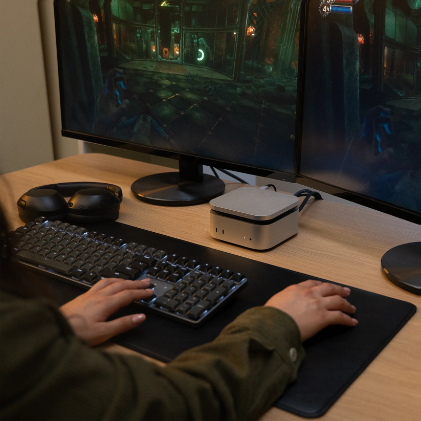 Stilren aluminiumskonstruksjon i kompakt format – matcher Mac mini og passer godt både på skrivebordet og i reisevesken. Integrert oppbevaringslomme for kabel sikrer ryddighet og gjør at alt ligger samlet.