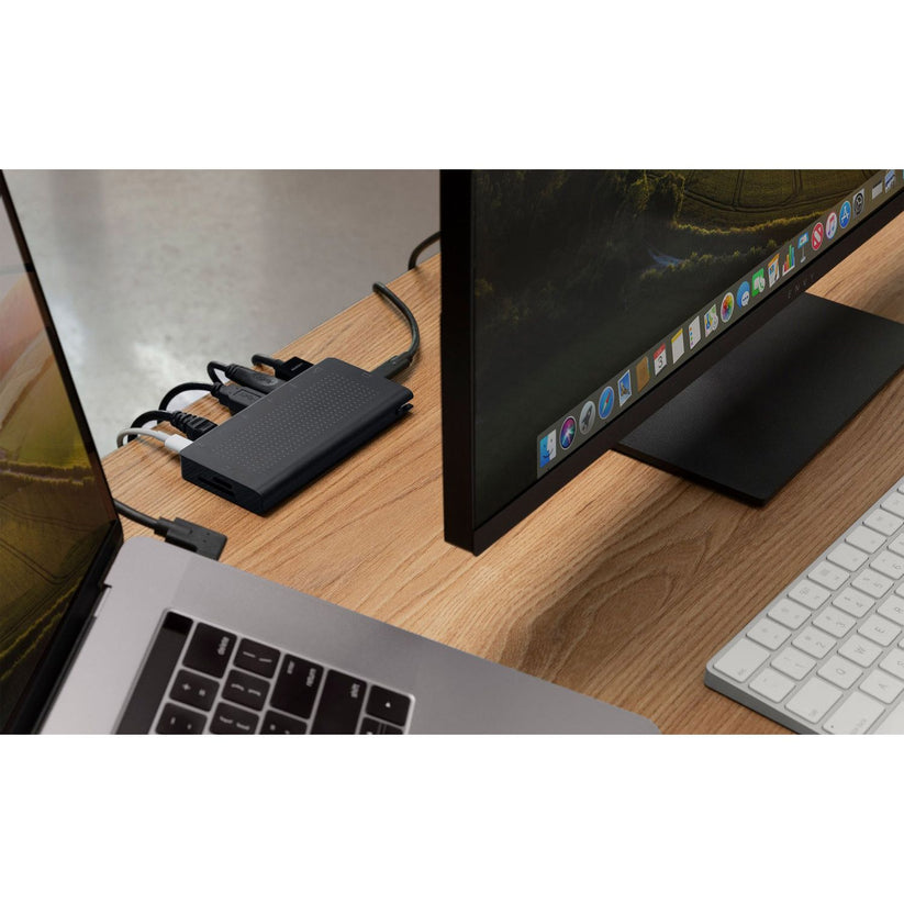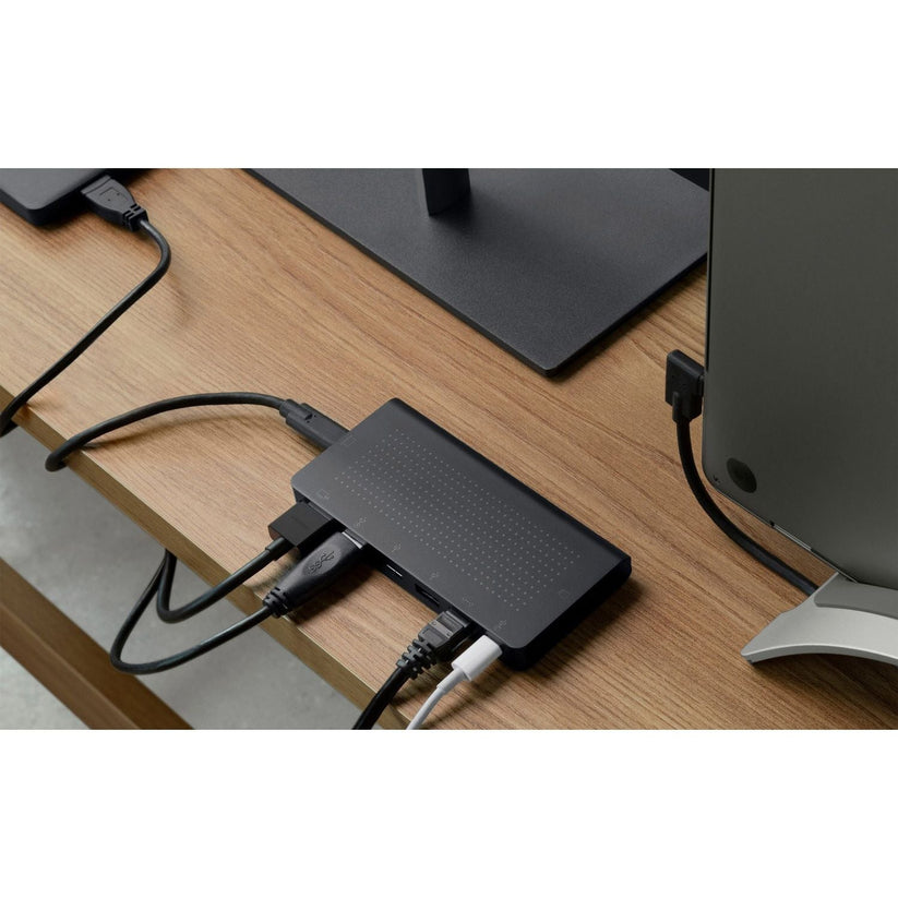 USB-C Hub kobler utstyret til din MacBook med stasjonærlengde-kabel, slik at tilkoblinger og strøm kan plasseres utenfor syne eller bak skrivebordet ditt, og skaper et ryddig arbeidsområde.