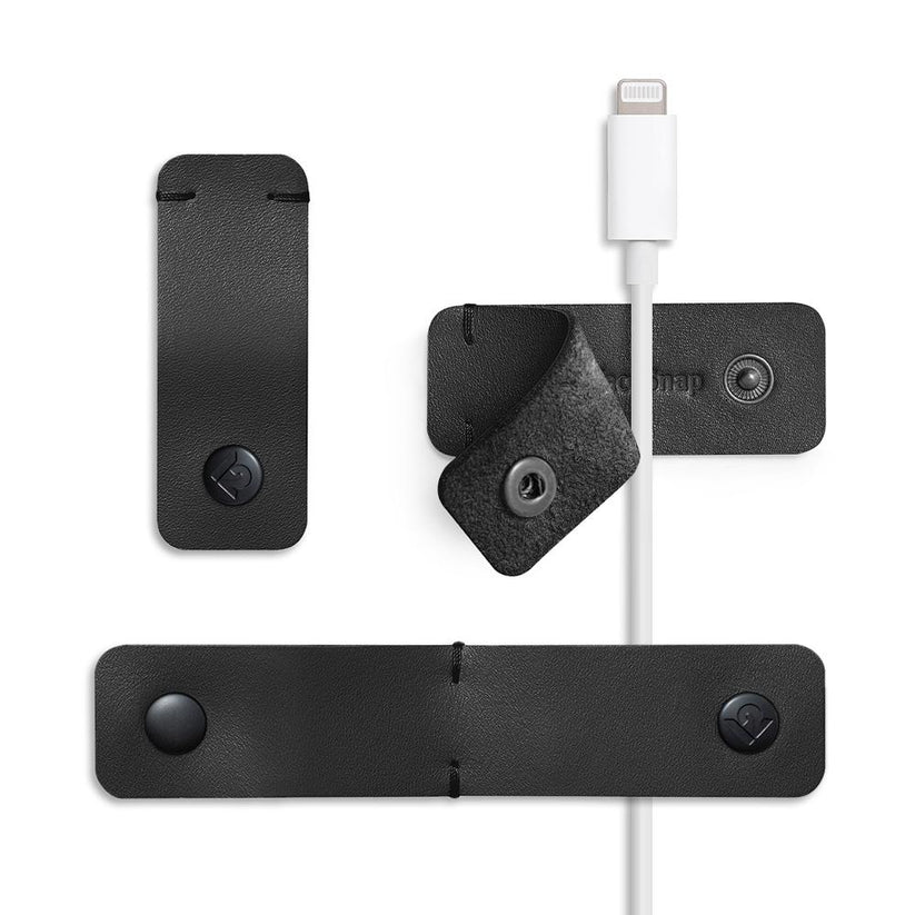 SurfaceSnap gjenoppfinner kabelhåndtering i form av elegante lærbånd med knapper. SurfaceSnap festes til nesten hvilken som helst overflate, og holder kabler ryddige.