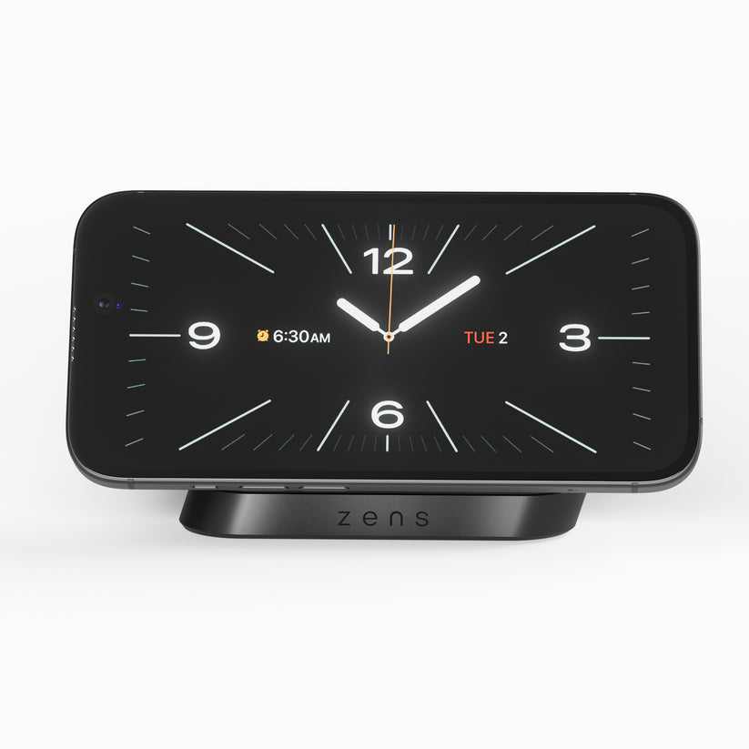 Zens Magnetiske nattbordslader er en solid og kompakt trådløs lader. Den innovative designen gjør at du kan lade en iPhone 12 eller nyere, både i stående og liggende modus. iPhonen og nattbordsladeren kobles magnetisk sammen perfekt, selv i et mørkt soverom, så du trenger ikke bekymre deg for å våkne opp og finne ut at iPhonen ikke har blitt ladet i løpet av natten. Med Apple StandBy-modus kan du enkelt gjøre iPhonen din om til en digital vekkerklokke. Derfor er denne laderen et fantastisk tillegg til ethvert nattbord, kjøkkenbenk eller skrivebord. Støtter også AirPods med MagSafe-funksjonalitet.